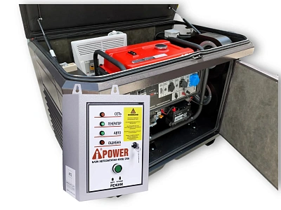 К бензогенератору A-iPower A7500TEA возможно подключение блока автоматического запуска. Данный блок коммутируется с домашней электросетью. При отключении центральной сети генератор запускается автоматически. Есть 2 варианта блоков АВР. АВР 230 необходим для резервирования однофазной городской сети. АВР 400 для резервирования трехфазной городской сети.