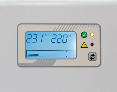 Панель управления с экраном, подсветкой и кнопками помогает увидеть и понять, как работает стабилизатор. Индикаторы подобны подсказкам, которые помогают нам что-то понять или выяснить. Они подобны маленьким знакам или подсказкам, которые говорят нам, что происходит или как что-то происходит. Если что-то пойдет не так, например, устройство перегреется или будет слишком сильно загружено, индикаторы загорятся красным и на экране появится сообщение. На экране также отображается важная информация о том, как работает устройство. В обычном режиме свет горит постоянно. Они мигают, когда устройство переключается на автоматический обход. Значение входного и выходного напряжения означает, сколько электроэнергии входит и выходит из устройства. Уровень нагрузки показывает, сколько энергии потребляет устройство. Если уровень нагрузки слишком высок, это может вызвать такие проблемы, как перегрузка и перегрев, которые подобны предупреждающим сообщениям о том, что что-то не так. Потребляемая мощность подключенных электроприборов означает, сколько электроэнергии потребляют эти приборы. Внутренняя температура продукта означает, насколько горячо устройство становится внутри. Функциональная клавиша представляет собой кнопку, которая позволяет вам выбирать, какая информация будет отображаться на экране, и изменять выходное напряжение в диапазоне от 220 до 230 вольт с шагом в 1 вольт.