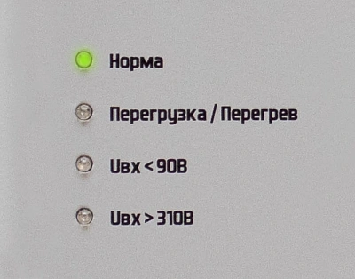 Устройство имеет четыре маленьких индикатора на передней панели, которые сообщают нам, что происходит. Есть индикатор «U>310 В», который сообщает нам, действительно ли подаваемая мощность высока (более 310 В). И есть индикатор «U<90 В», который сообщает нам, действительно ли подаваемая мощность низкая (менее 90 В). Другой индикатор под названием «Перегрев/перегрузка» сообщает нам, что устройство слишком нагревается или к нему подключено слишком много устройств. Один индикатор под названием «Нормальный» говорит нам, что все работает правильно.